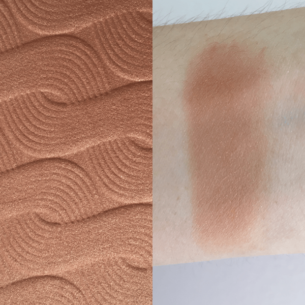The consistency of the bronzer is really different, in a good way! It feels like a hybrid between cream and powder. When swatched, this bronzer feels super silky on the skin, which is nice because most powder bronzers can be slightly chalky and have a lot of fallout. This bronzer is very evenly pigmented and doesn’t transfer the visible glitter that is on the pan, onto your face. I have a feeling it is an overspray and once I use the entire top layer of this product, a satin bronzer will be underneath! Overall this bronzer applies in a really natural way once on the skin. I believe the unique silky texture forces this product to blend in with your skin without any harsh likes. Once finished applying this bronzer, it truly just looks like a natural tan.