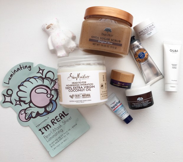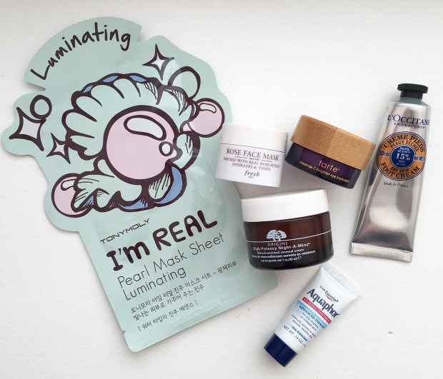 Now that I have clean skin and I’m feeling super relaxed, it’s time for a face mask! My favorite one to apply is the award winning Fresh “Rose Face Mask” because it not only hydrates, but it also tones! I feel like it’s so hard to find a mask that does both! It’s all-natural and smells like fresh roses! Sometimes I feel like doing something fun and different so I’ll grab a sheet mask instead! I love the Tony Moly line of sheet masks because there is such variety available for all the different skin types out there! Plus, the packaging is absolutely adorable! After I’ve left my face mask on for about 20-30 minutes, I rinse that off and immediately apply my nightly skincare! I’ve been using my favorite Origins “High Potency Night-A-Mins” moisturizer for years and it is SO GOOD! I recommend this product to everyone, dry skin, combo, or oily skin; you just need it! I also always apply an eye cream, recently I’ve been loving the Tarte “Maracuja C-Brighter Eye Treatment” because it’s incredibly hydrating and helps plump up the skin where I have fine lines! Now that I’m finished with my face, it’s time to treat my feet! If you are in need of a super hydrating and luxurious lotion for an at-home pedicure, then you must try the L’Occitane Foot Cream! It is incredible the difference that this makes, especially on my heels! I’ve been a fan of the hand cream for awhile now, but this product is a game changer! Of course, I can’t forget about my lips and every single night I apply Aquaphor to keep them moisturized! It doesn’t have a scent, which I love and I always wake up with hydrated lippies that are ready for lipstick application!