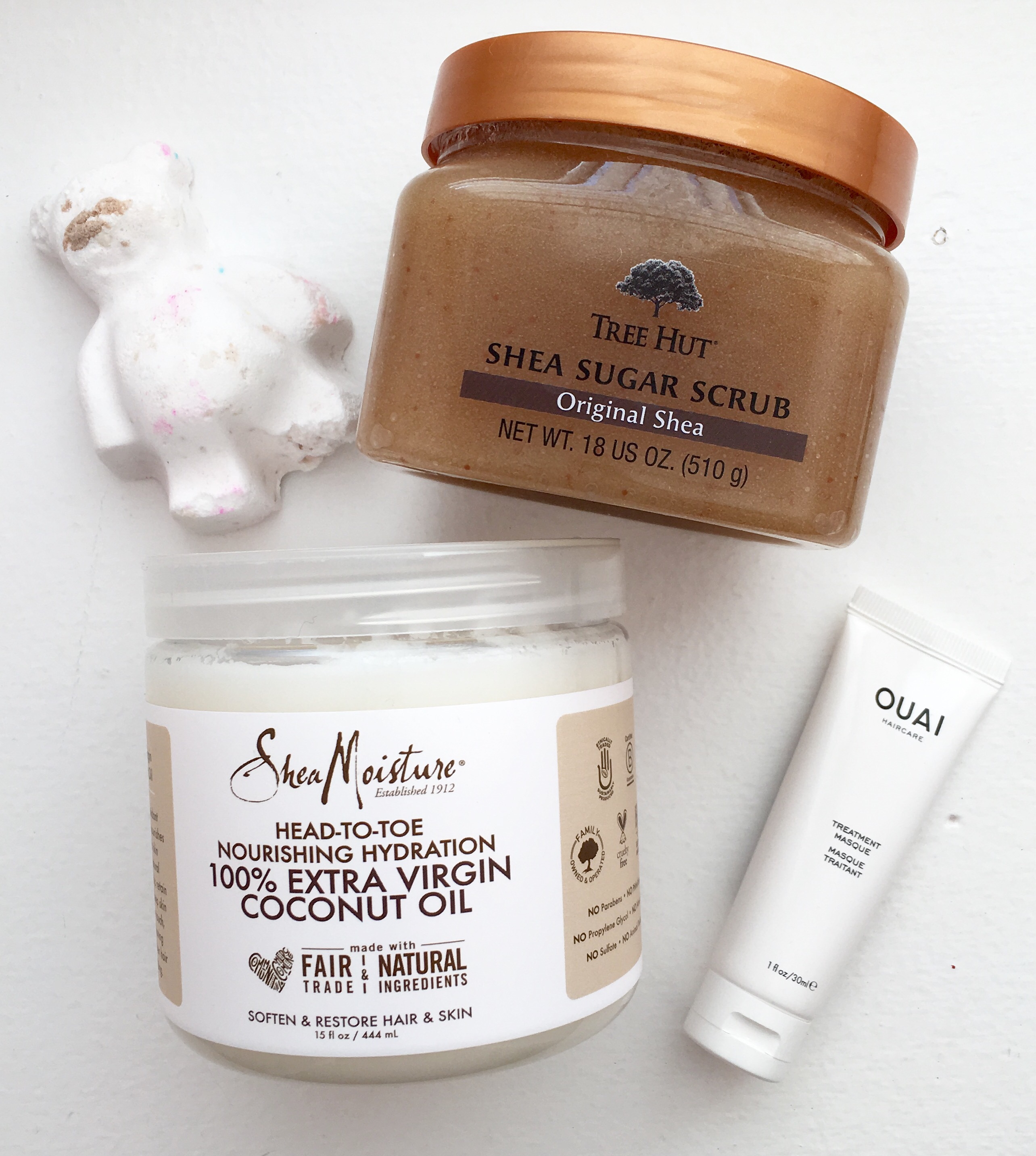 My first step in my pamper routine is to take a hot bath! This is essential because too often I just shower super quickly and forget to even take the time to unwind in a jacuzzi bath. I love using LUSH Bath Bombs because they smell amazing and make your water look really pretty! This one is the, “Butterbear” Bath Bomb and it smells incredible, just like cocoa powder! Next, I like to exfoliate my body with a sugar scrub! I love using the Tree Hut “Sugar Shea Scrub” from head-to-toe! It’s gentle enough to not irritate my sensitive skin, however it will remove all dead skin and any remaining self tanner that hasn’t faded off naturally! After I’ve shampooed and conditioned my hair, I like to apply a hair mask to give extra moisture and help repair any dry/damaged strands! Recently, I’ve been obsessed with the OUAI “Treatment Mask.” I just apply it on my clean, damp hair and let it sit for 10-15 minutes. My hair feels like absolute silk when I’m finished with it! Lastly, once I’m finished with the bath and completely dried off, I like to apply the Shea Moisture “100% Extra Virgin Coconut Oil” all over my body, like I would a regular lotion. I feel like I’ve seen a difference in my skin since I switched over to coconut oil from body creams! Not only does it feel more hydrated and healthy, but I’ve noticed it’s not as itchy and irritated, which would happen all the time after using artificially scented body butters. I definitely can’t use this product as a hair mask because it’s way too heavy and I look like a greased chicken the next day, but it makes an awesome all over the body moisturizer!