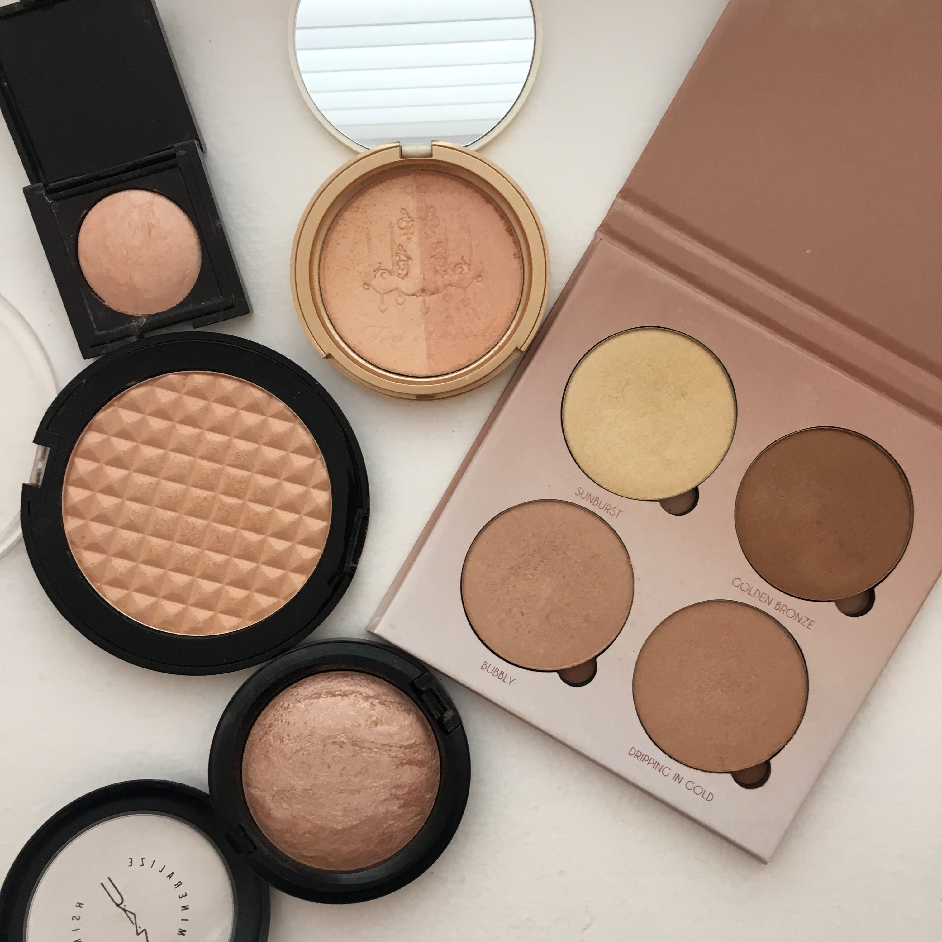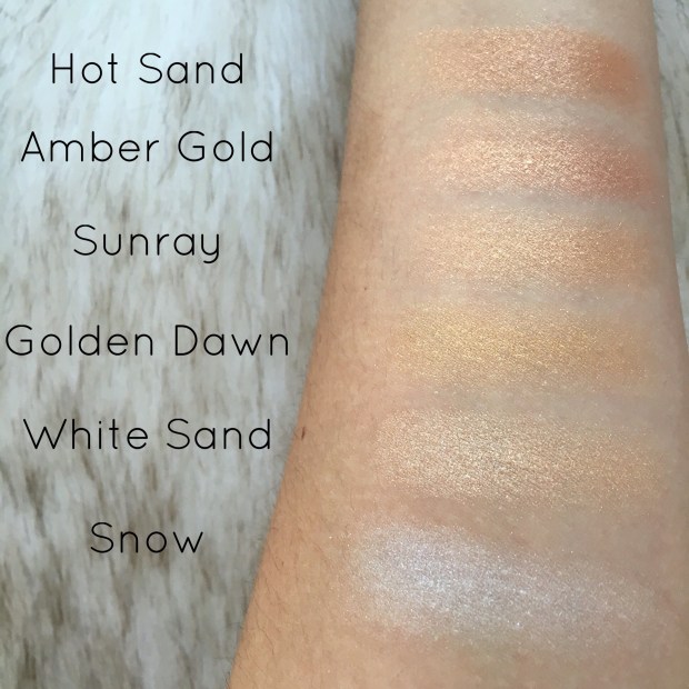 Starting on the bottom row, we have “Sunray,” which I would describe as a peachier version of “White Sand.” This shade has a lot of golden glitter, which looks awesome in photos, but a little odd in natural lighting. I feel like this shade will give you an Instagram worthy highlight in flash photography, but it kind of emphasizes texture and comes across super unnatural in person. I was also displeased with this formula because it was super chunky, most likely from all the glitter packed into the pan.