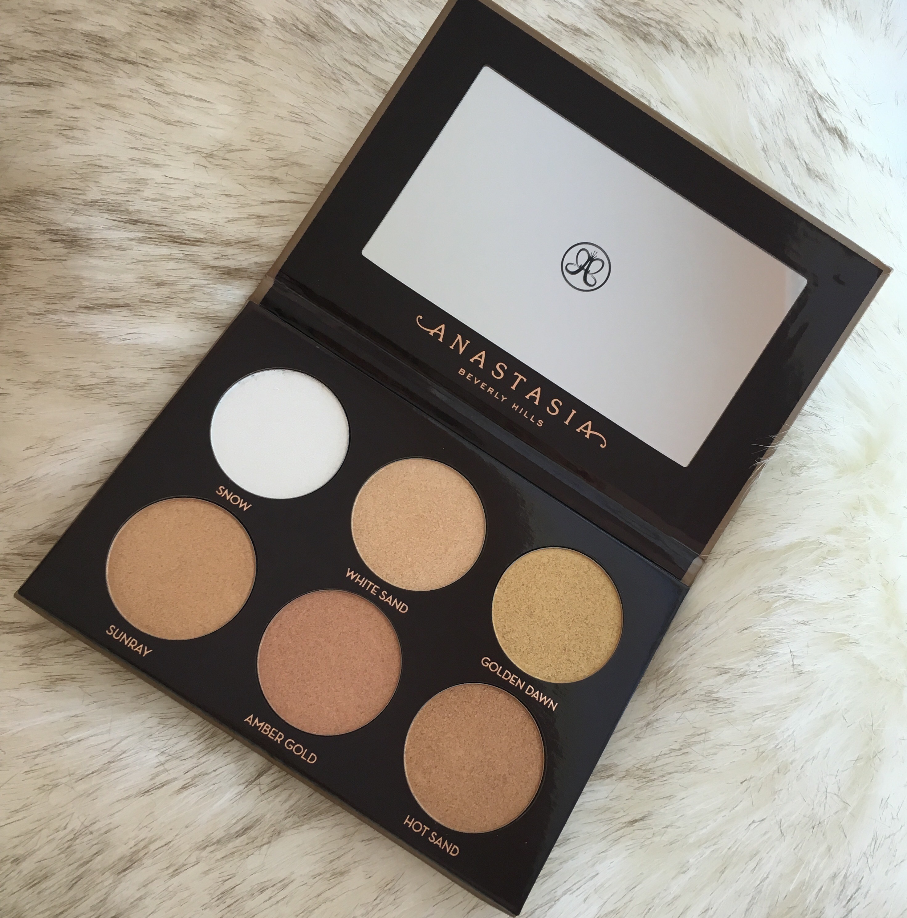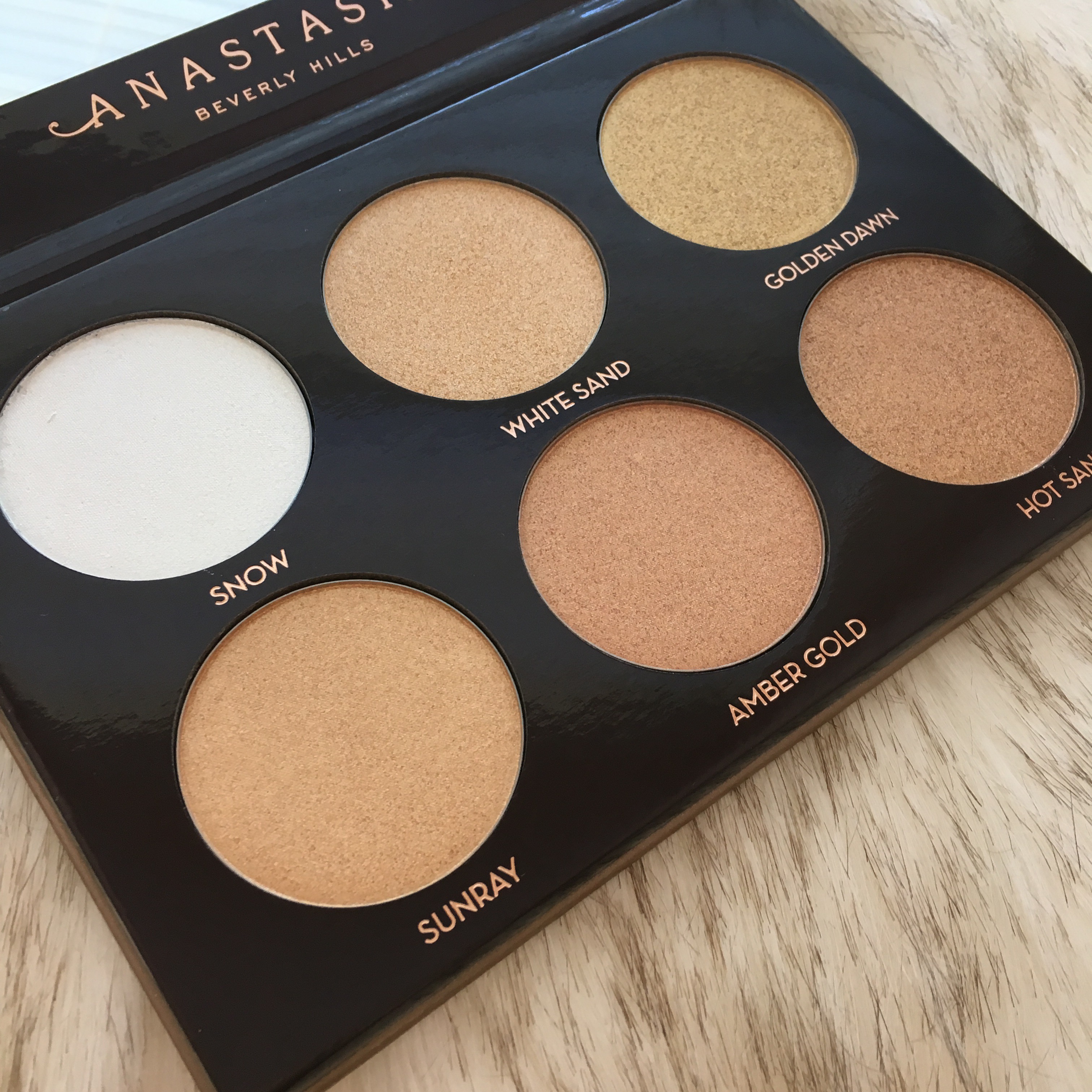 “Amber Gold” is another extremely glittery shade that has a ton of champagne and gold reflects. This one has a creamier formula, which makes the glitter blend out into nothing once applied onto your cheeks, but still…I don’t know why the majority of these shades are packed with so much loose glitter. None of the other Anastasia Glow Kits that I have tried have this formula, so I don’t know what exactly enticed the brand to change it up.
